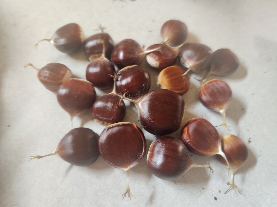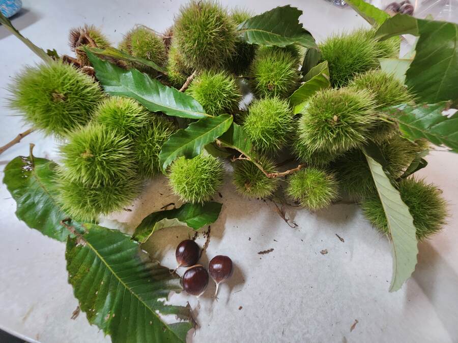 Even with the threat of bad weather, we had volunteers come to help collect open-pollinated chestnut burs and nuts today, at the Pryor Orchard. We thank the first-time volunteers, Kelly, David and Gwen, for several hours of pulling burs off of the trees and collecting burs and nuts off the ground. Jamie Van Clief of TACF, and regular volunteers, Jon Taylor and Peggy MacDonald, were also present. The nuts will have several uses. Also, by removing the nuts from the fenced orchard, it will remove a food source for the chestnut weevil, a pest of chestnuts, by reducing its population in future years.